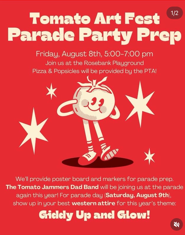 Join Rosebank Elementary for their Parade Prep TOMORROW Friday, August 8th on the Rosebank Playground to make signs for the Tomato Art Fest parade on Saturday. You can find the full TomatoFest schedule by clicking here.