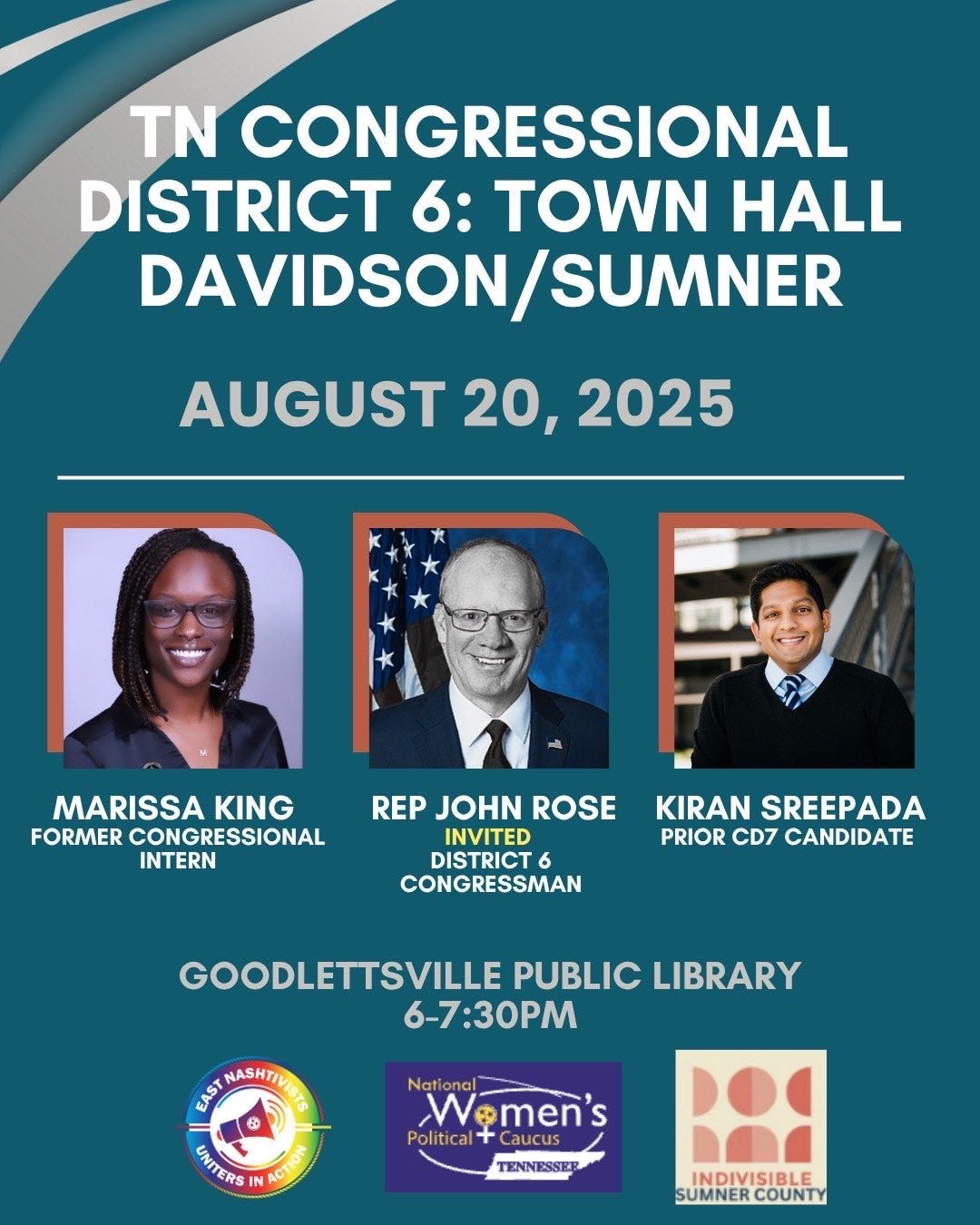 Join East Nashtivists, the Tennessee National Women’s Political Caucus, and Indivisible Sumner County for an August Recess Townhall on August 20th from 6-7:30 PM.